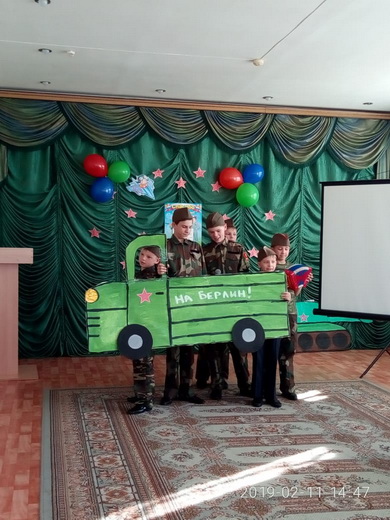 а маленькие участники дошколята исполнили песни «Будем в армии служить» и «Мы шагаем как солдаты». В своих выступлениях участники использовали военную атрибутику танк, фронтовой грузовик изготовленный своими руками, оружие ну и конечно же военную форму. В завершении конкурса ребята все вместе исполнили песню «Служить России». Дети очень старались и в итоге определились победители конкурса.